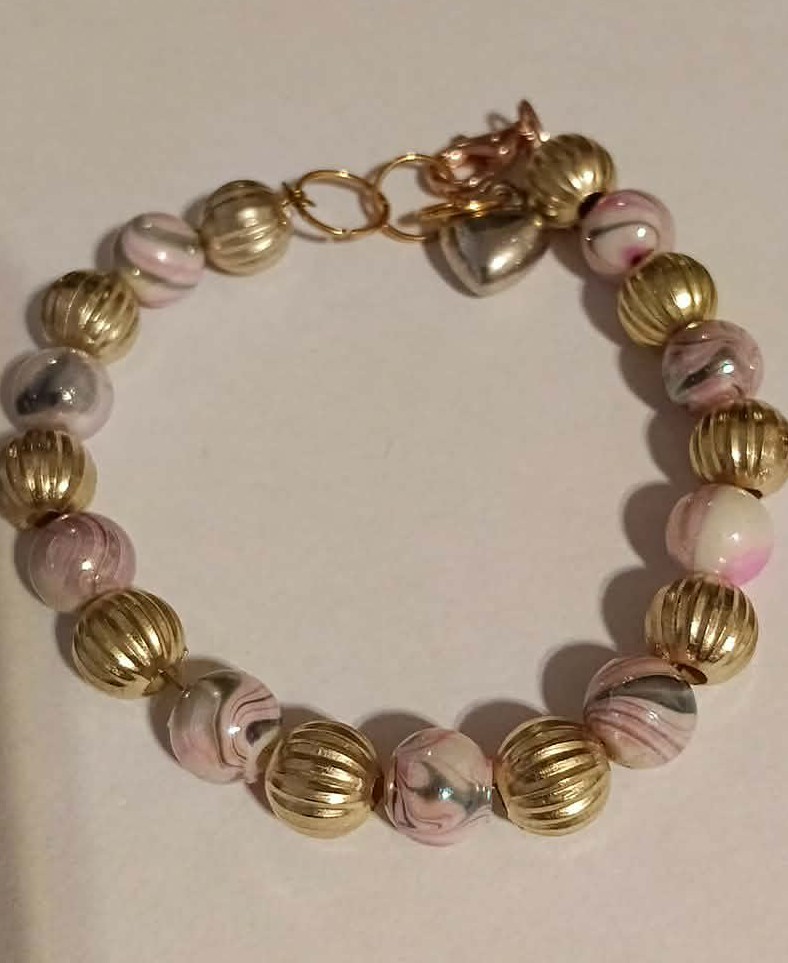 Bransoletka zrobiona jest kuleczek w prążki w kolorze złotym oraz kuleczki przeplatane kolorem różu.