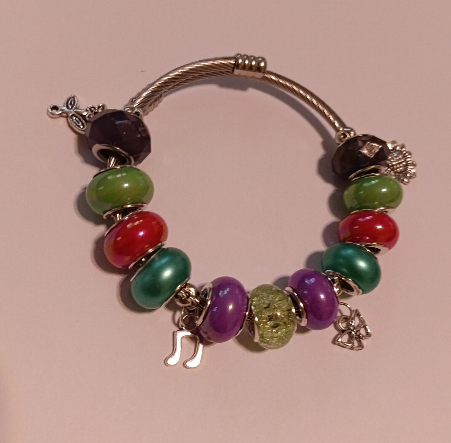 Bransoletka ma kilka ładnych zawieszek takich jak- kwiatek, nutka, motylek itp.